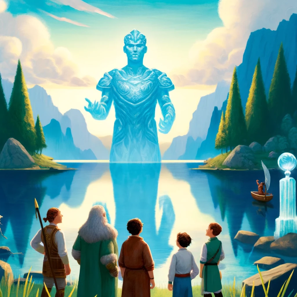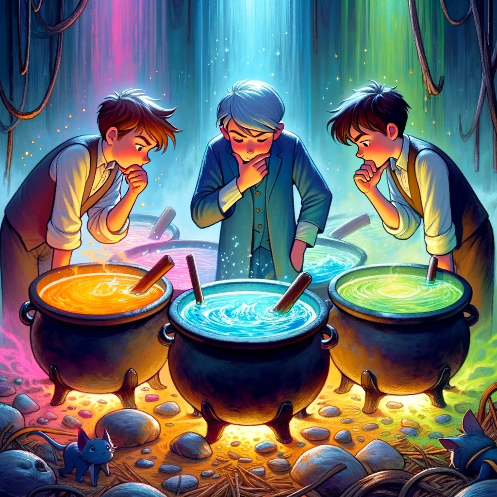水精靈帶著他們來到湖泊邊的一片空地,這裡擺放著三個大缸,裡面裝滿了不同的液體。水精靈說:“這是智慧的試煉。每個缸裡都有不同的液體,只有一個缸裡裝的是純淨的水。你們需要辨別出哪一個是正確的。”