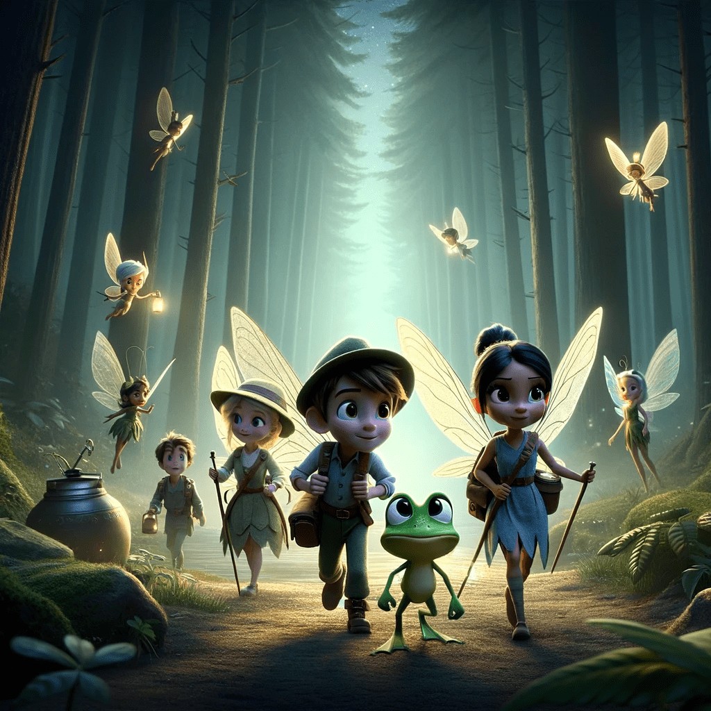 湯姆在花園裡漫步,不久後,他聽到了微弱的笑聲和音樂聲。他順著聲音走去,發現了一群精靈和花仙子在一棵巨大的老樹下跳舞。這些精靈和花仙子比手掌還小,他們的翅膀閃爍著亮麗的光芒,舞姿輕盈如雲。