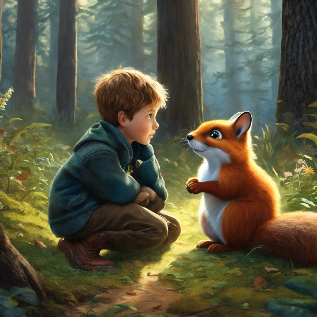 小男孩驚訝地看到動物們居然會說話,但他很快鎮定下來,回答道:“我叫彼得。我來這裡探險,但似乎迷路了。”