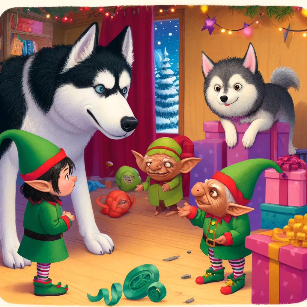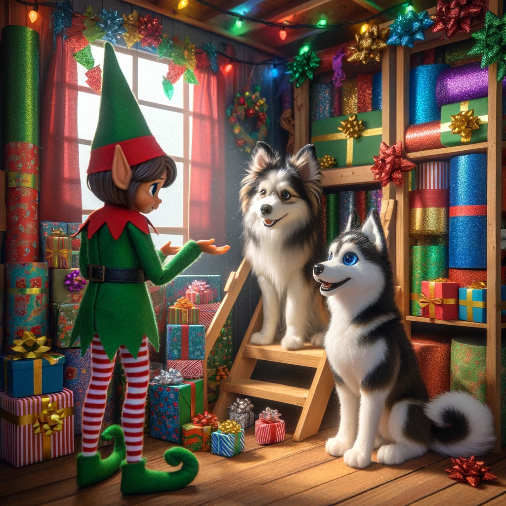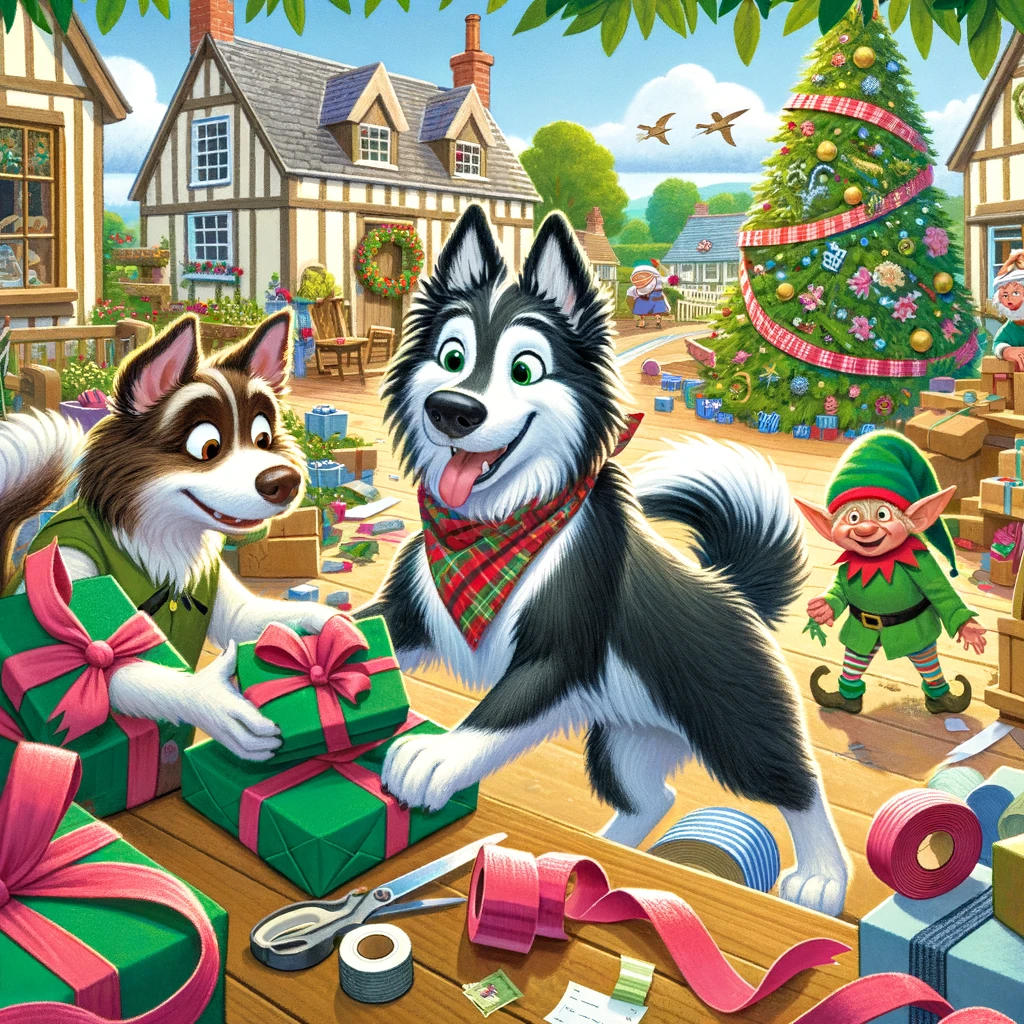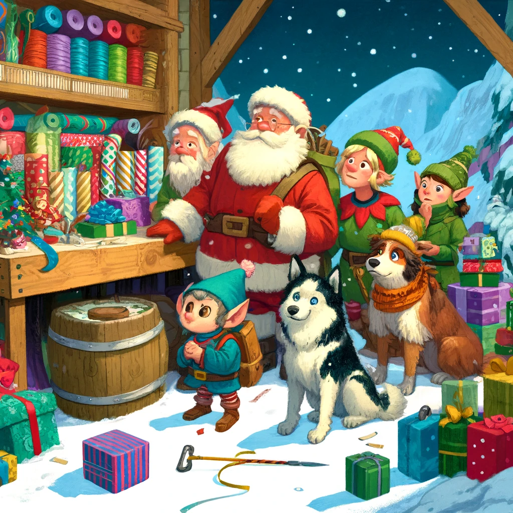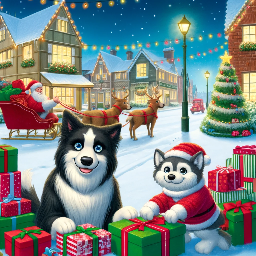 在北極的一個寧靜村莊裡,聖誕老公公和他的精靈們正在忙碌地準備著即將到來的聖誕節。這是一個充滿了歡樂和期待的時節,孩子們都盼望著從聖誕老公公那裡收到夢寐以求的禮物。村莊裡有兩個最忠誠的夥伴——邊境牧羊犬比利和哈士奇魯迪,他們每天都幫助聖誕老公公和精靈們完成各種任務。