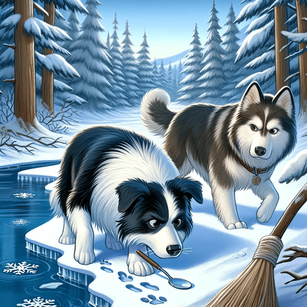 比利和魯迪開始在村莊周圍尋找線索。他們穿過積雪覆蓋的森林,經過冰封的湖泊,努力尋找任何可能遺失包裝紙和絲帶的痕跡。比利用他的靈敏嗅覺在雪地裡尋找氣味,而魯迪則用他的敏捷身手在每一個角落探查。